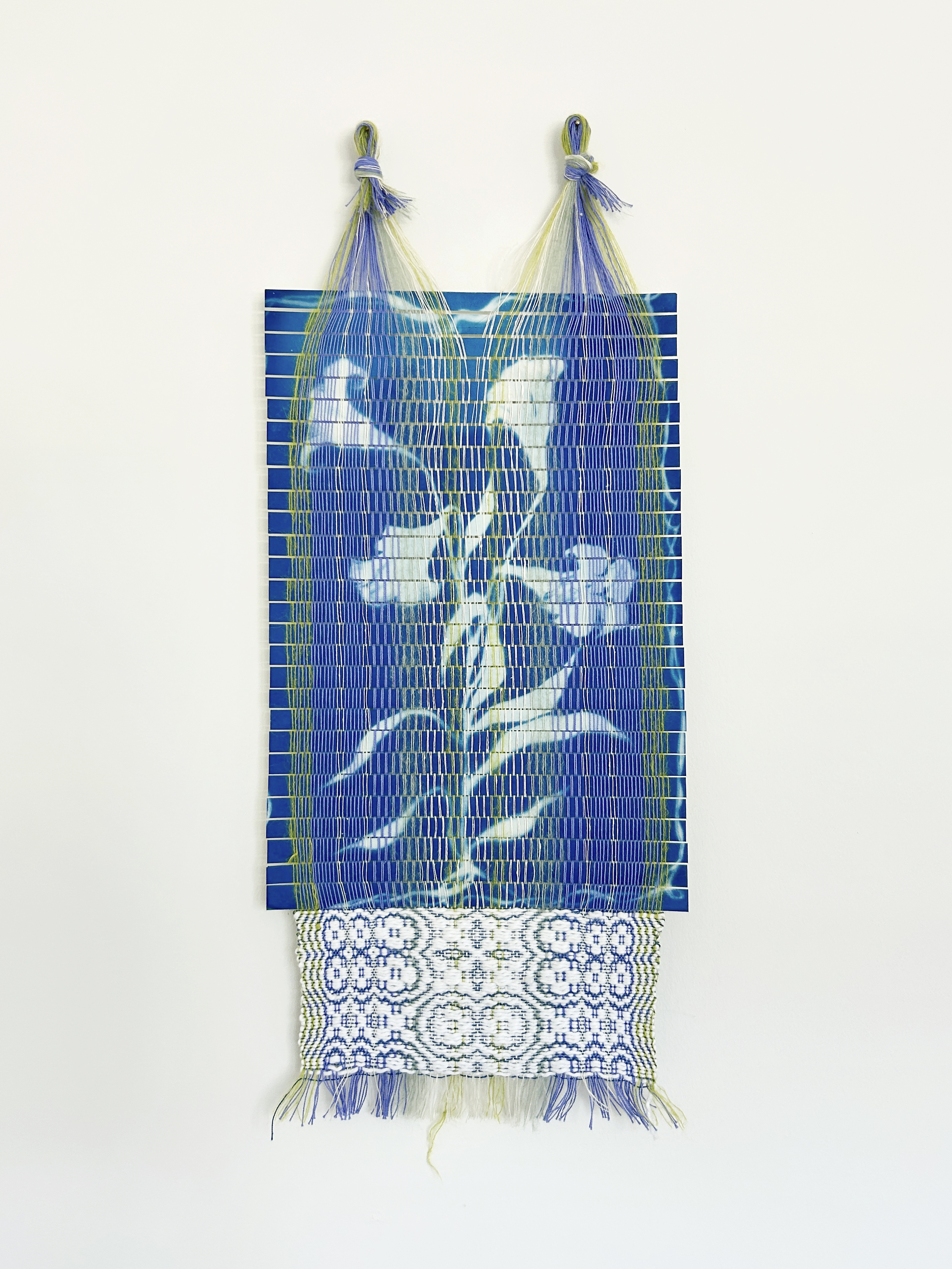 cyanotype on paper, cotton, linen, mohair threads, woven on four harness floor loom.
