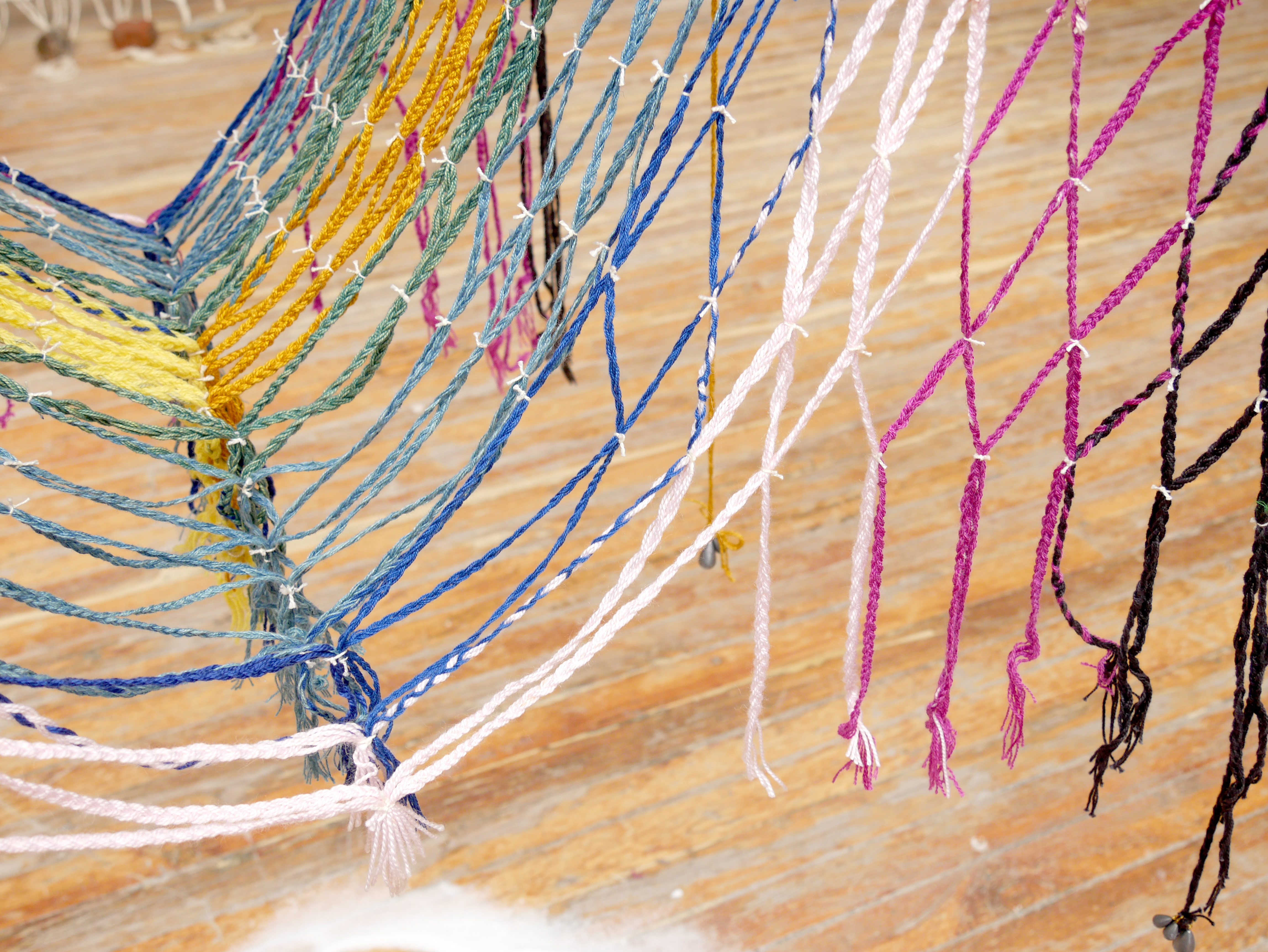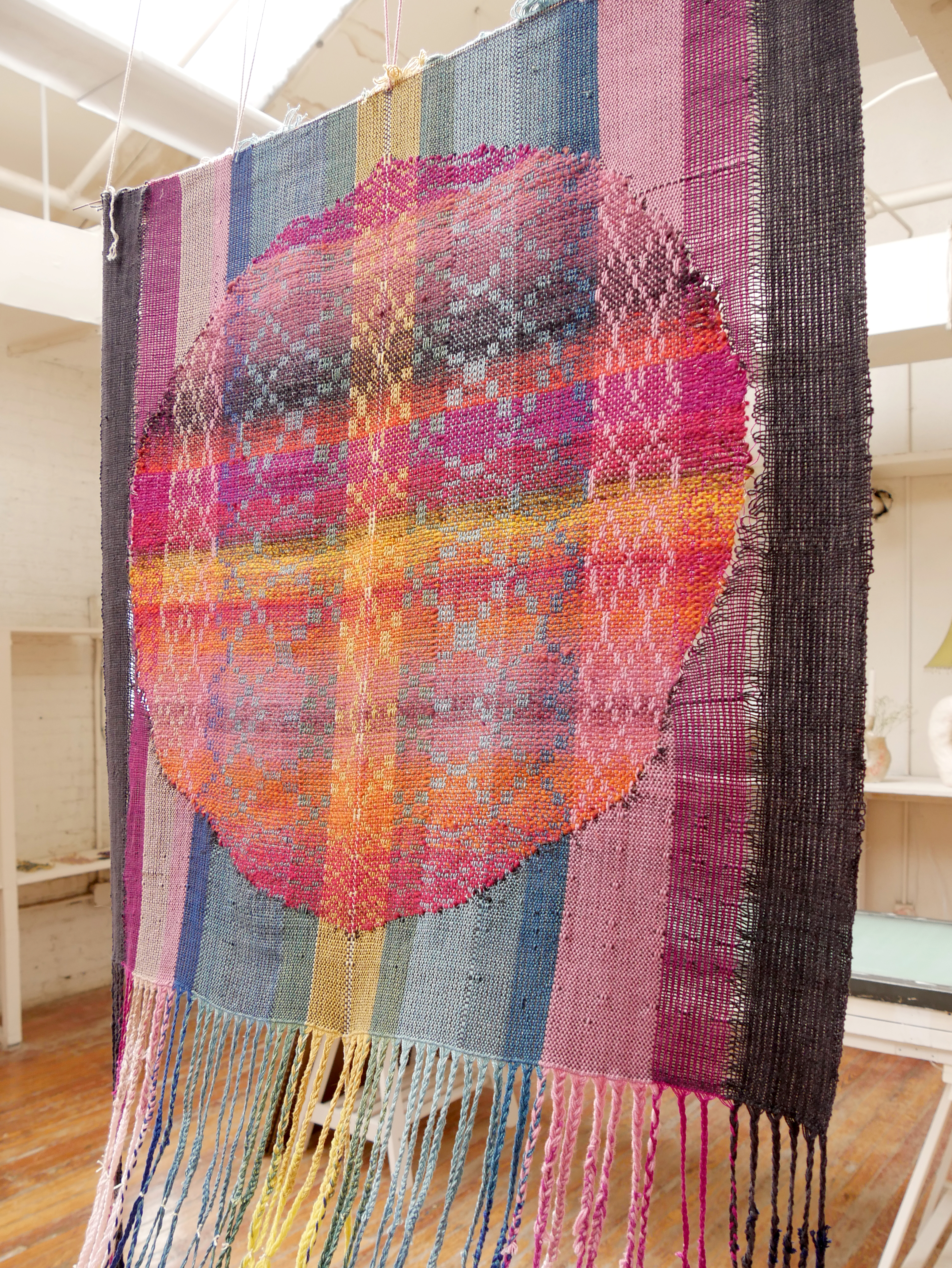 hand-drafted cloth woven on 8-harness floor loom, warp naturally dyed with logwood, cochineal, indigo, weld, marigold, with recycled weft yarn, salt.
