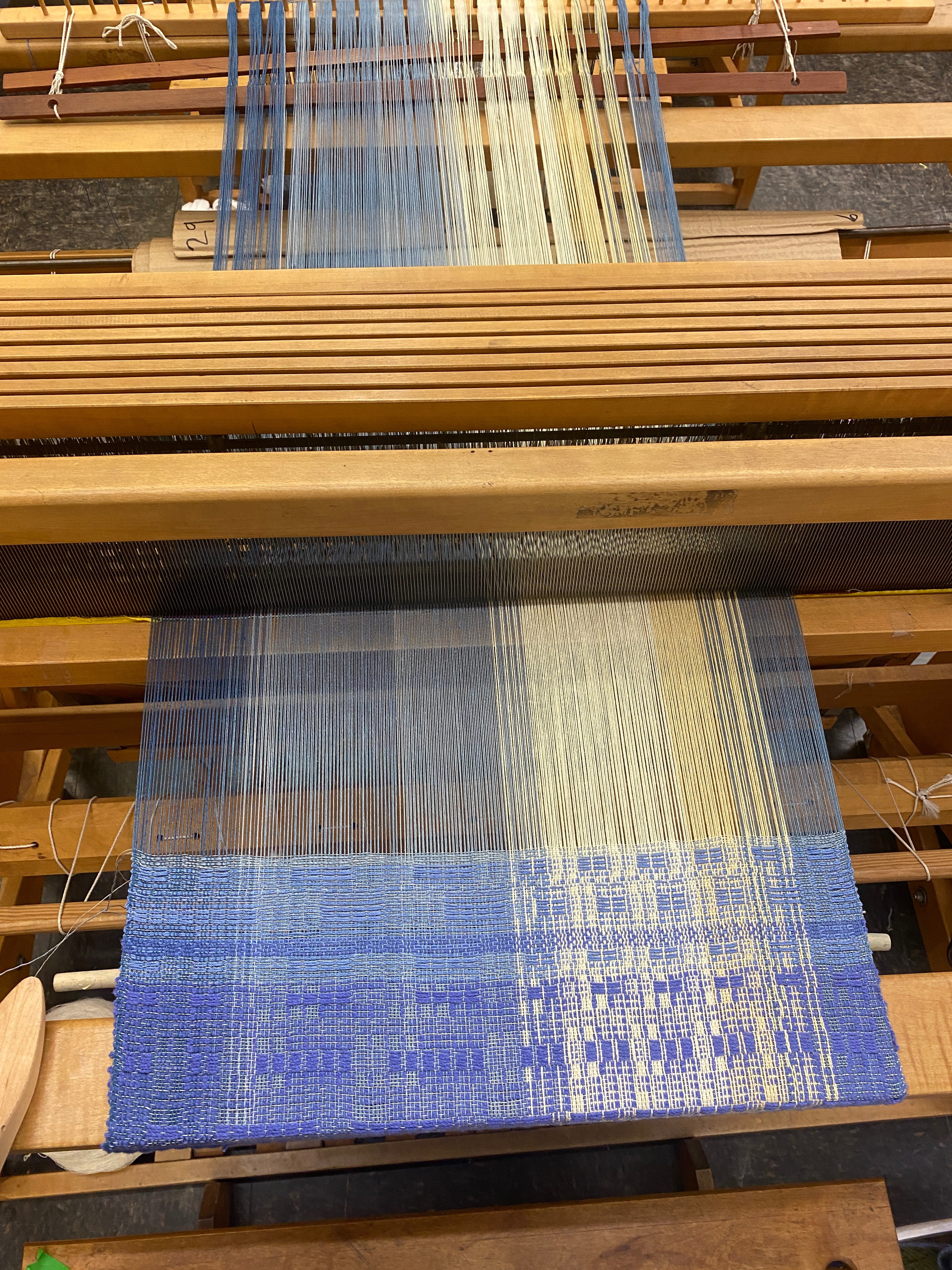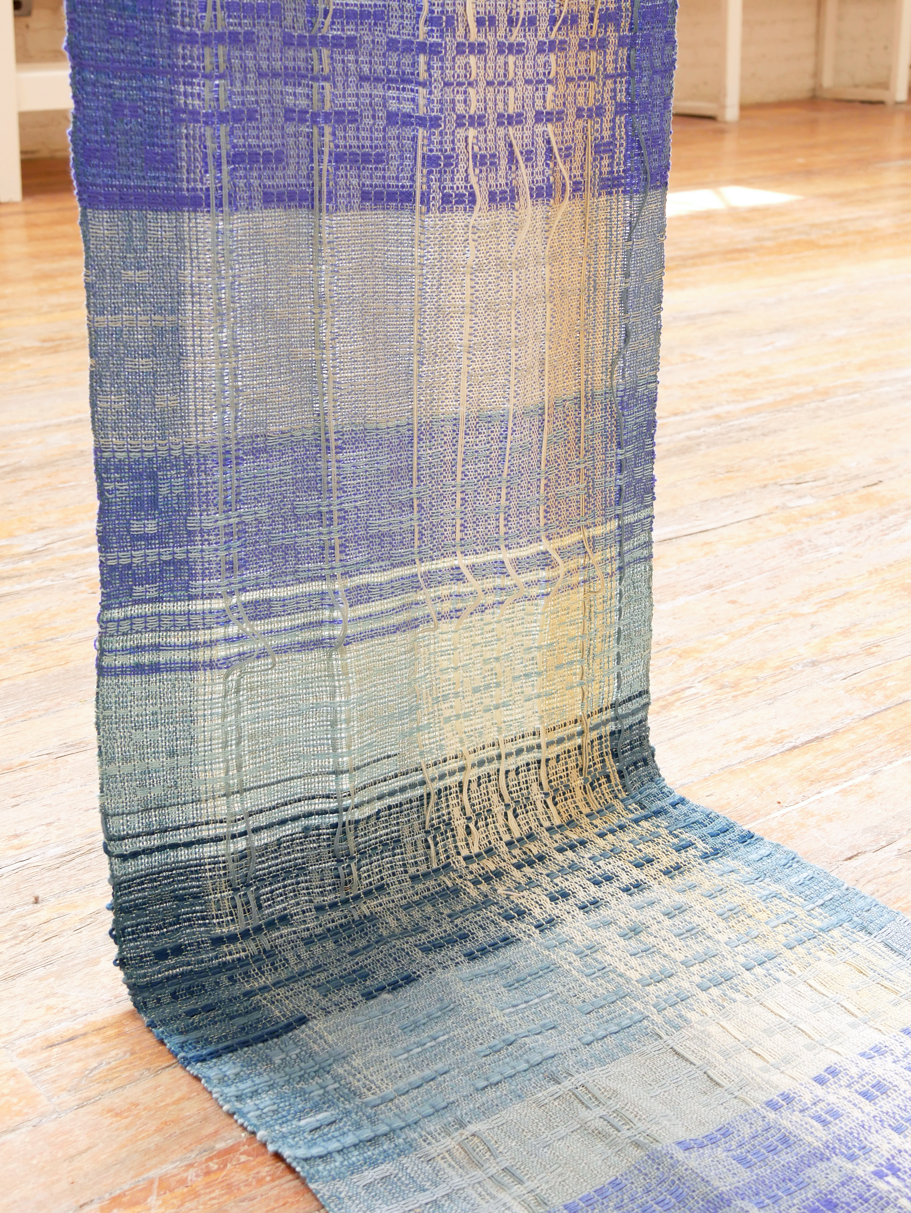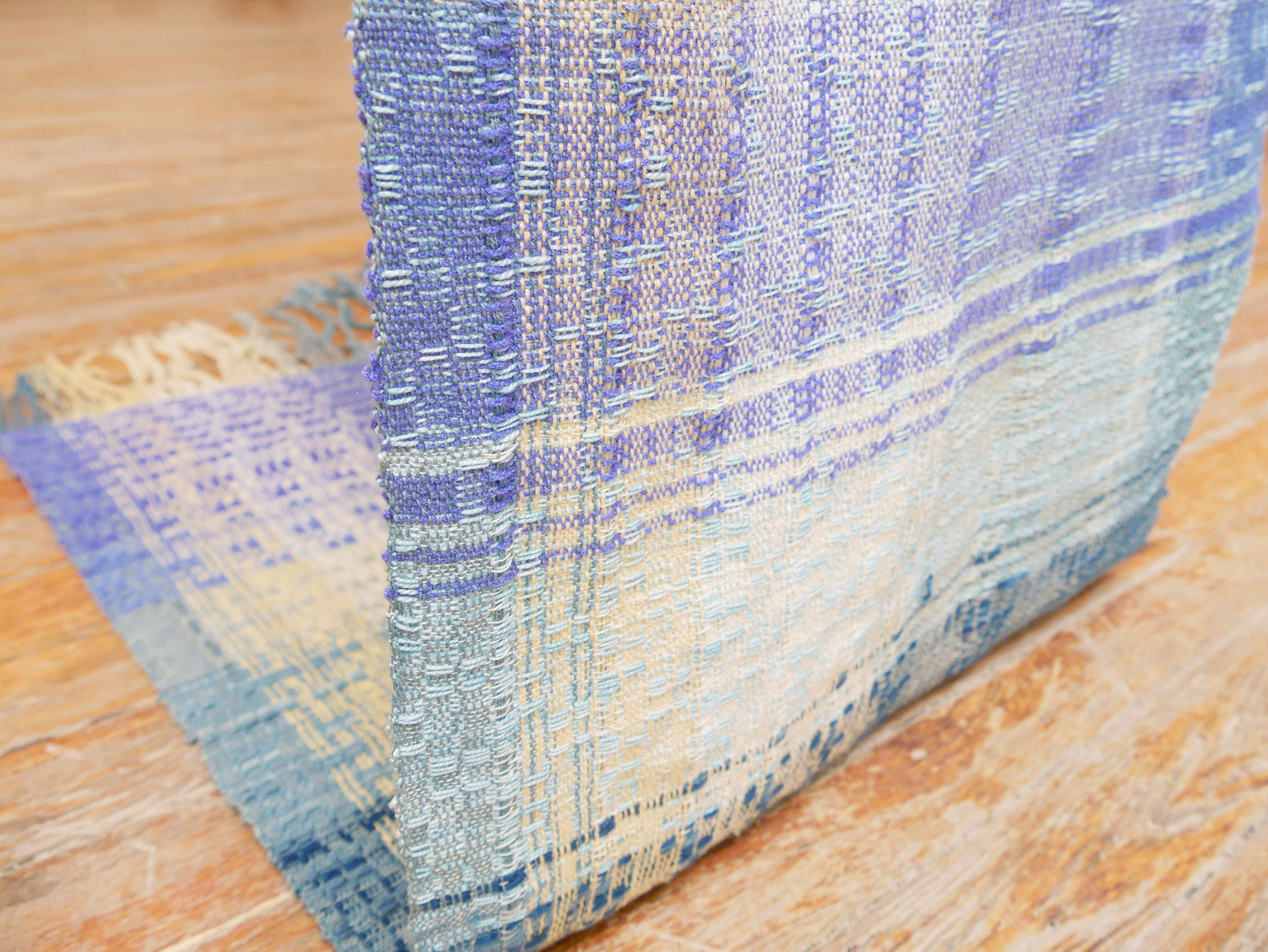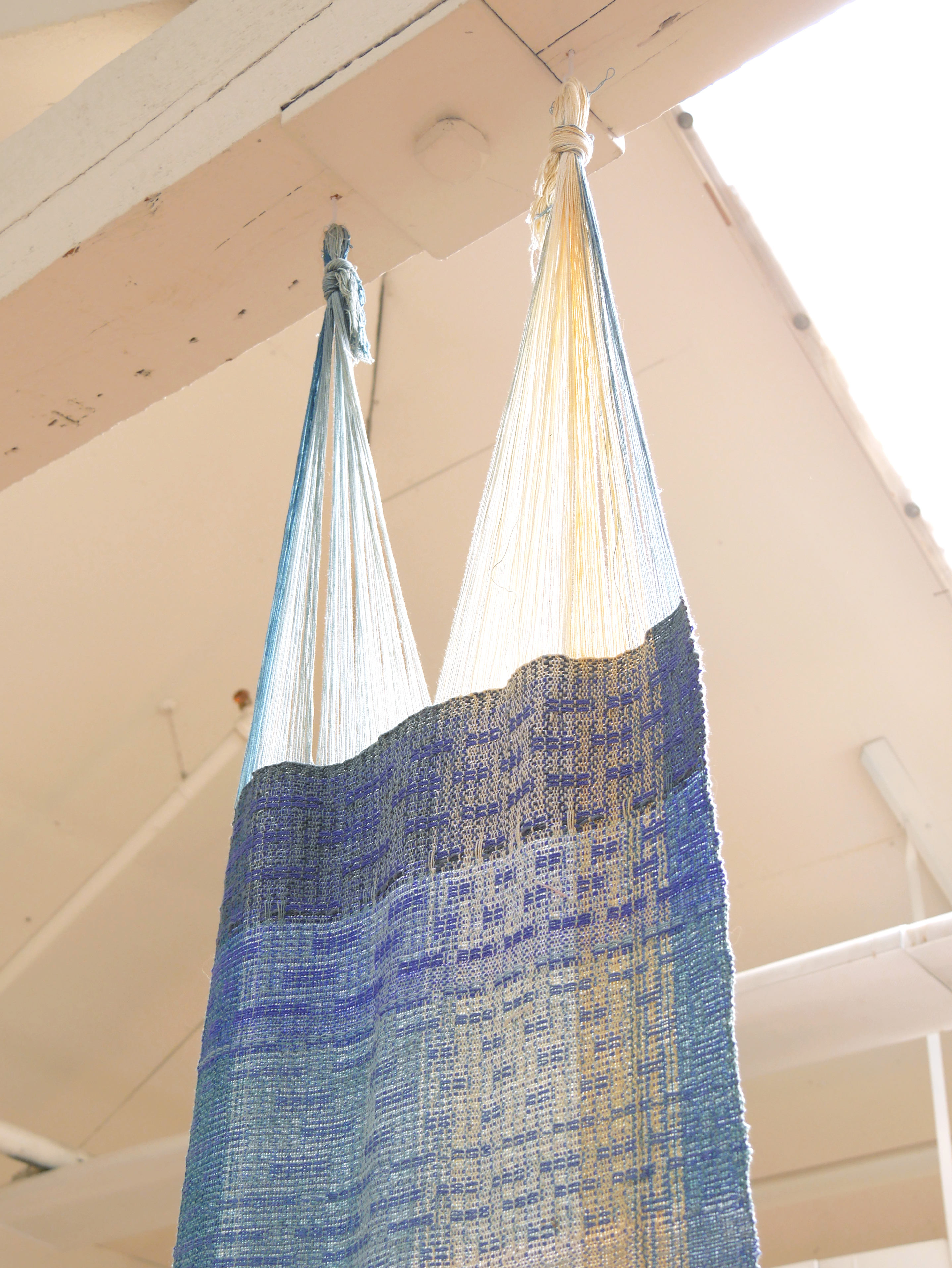 hand-drafted cloth woven on 8-harness floor loom, warp naturally dyed with locally sourced indigo and african + peruvian marigolds. weft recycled and assorted yarns.